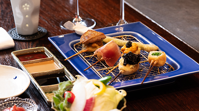 ・旬の食材を一口サイズで揚げた串は、ワインや日本酒とも好相性。